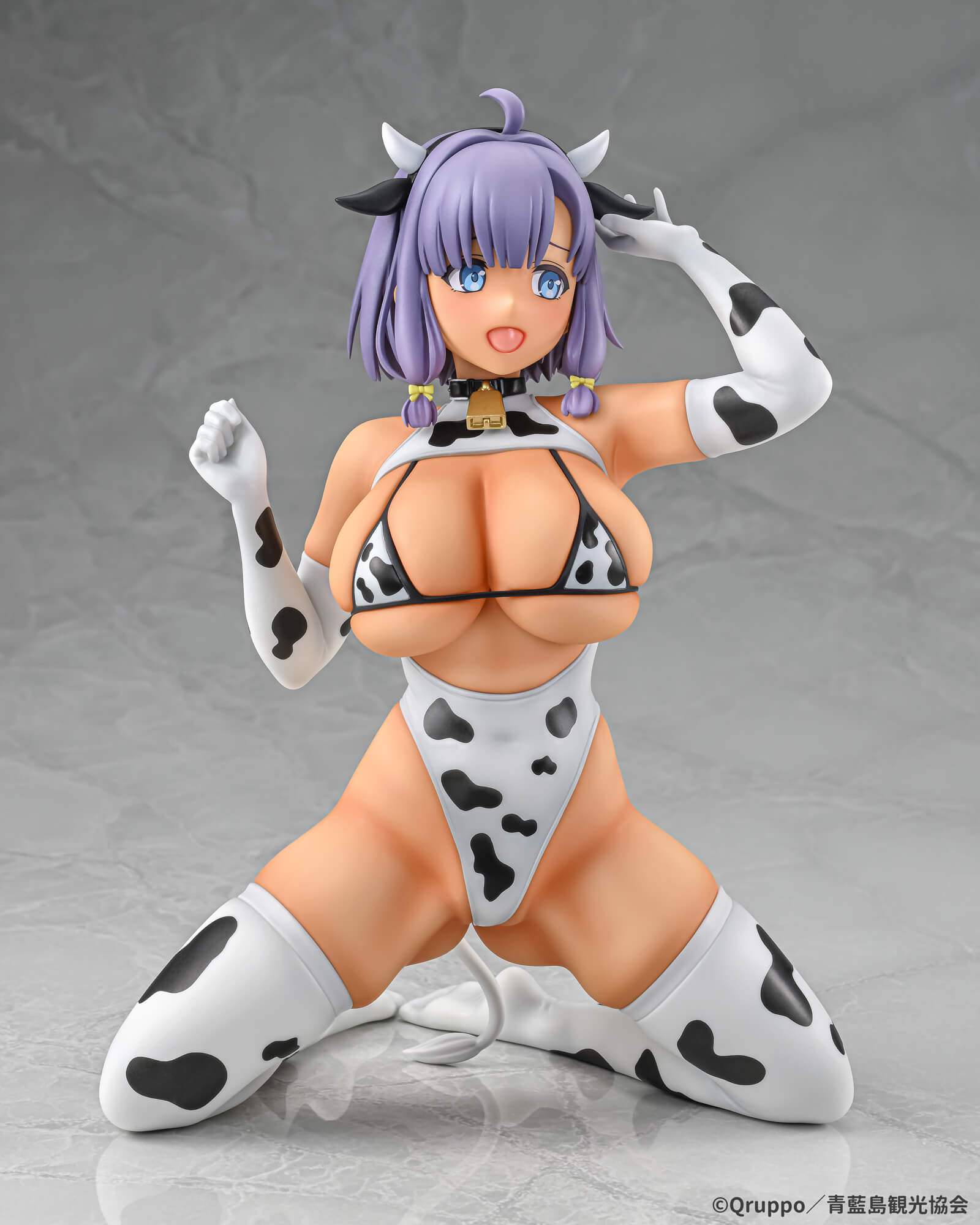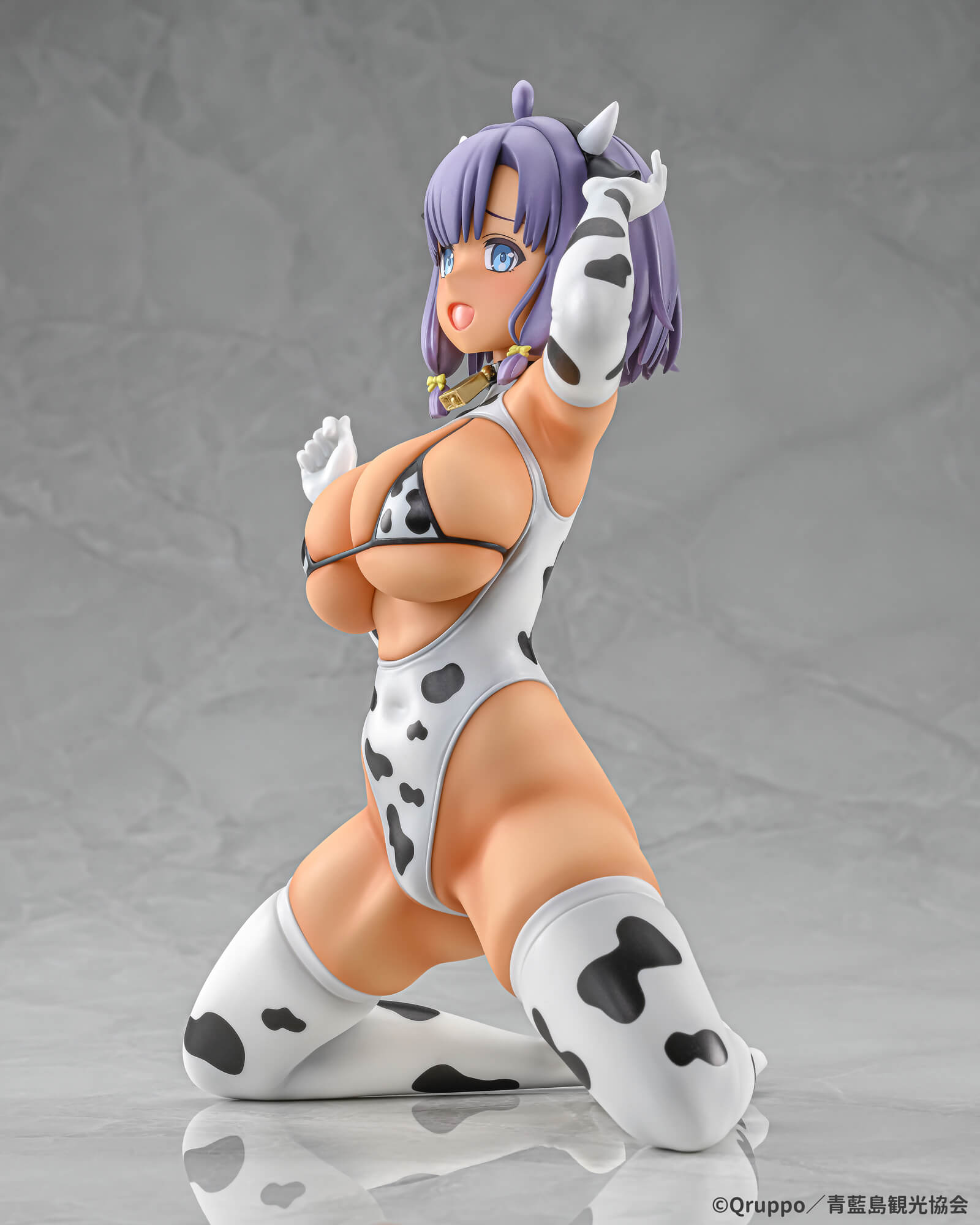 牛柄のコスチュームに身を包み、水着で締め付けられた大きな胸や、お尻に食い込む柔らかな造形が魅力的です。